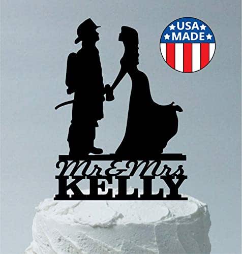 Firefighter Wedding Cake Topper. This is a lovely wedding cake topper with a firefighter holding up his bride. There are a lot of options out there, but this one you can customize this Firefighter Silhouette for your wedding cake.