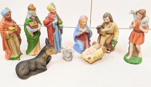 The set includes the following: three Wiseman, a Shepard, a Lamb, a Donkey, Mary, Joseph, Baby Jesus, Manager, Two Shepard Staffs.
